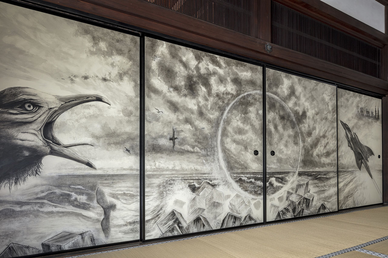 The Danna no Ma room of Shinjuan’s main hall previously contained fusuma paintings painted by Hasegawa Tōhaku, a painter deeply associated with the Momoyama period of the late sixteenth century alongside such historical figures as Sen no Rikyū, founder of the tea ceremony, and the military leader Toyotomi Hideyoshi. Yamaga Hiroyuki, principal of Gainax, the studio that gave birth to Neon Genesis Evangelion, was commissioned to create new images to appear where the Tōhaku ink-brush fusuma paintings had been previously. Yamaga took up residence in Shinjuan in autumn 2017 and began the work, which he finally completed in March 2018.