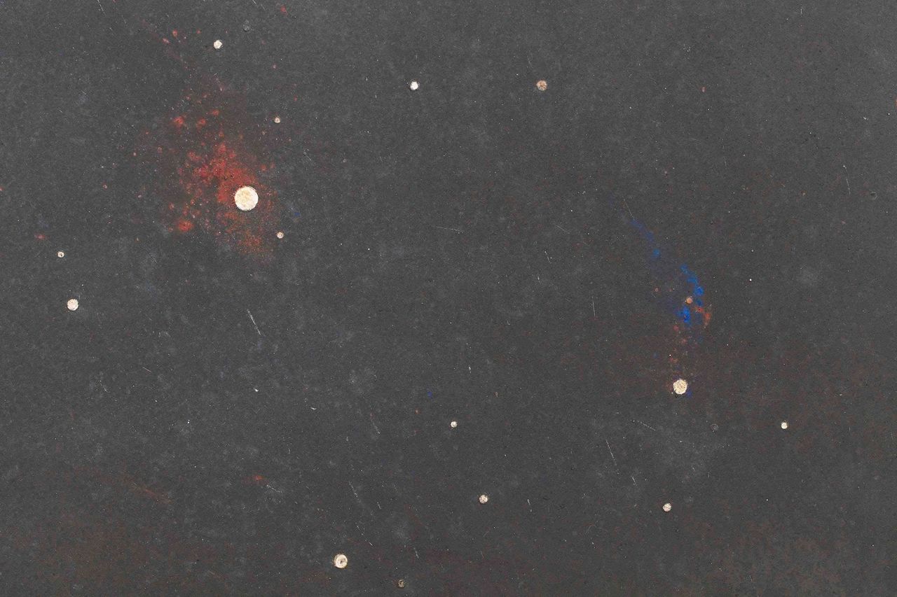 He coats this ganpi paper by blowing ink made from pine soot and glue onto the paper until it is jet black. This is followed by pressing pieces of silver leaf one at a time onto the blackened paper, applying another coat of the ink on top of that. Repeating this work many times causes the appearance of faint particles of light—reflecting from the bits of silver leaf that still show through, inversely to the deepening darkness—suggesting light reaching us from stars thousands of light years away. As a finishing touch, the artist lights custom-made fireworks including compounds of dyes and pigments, sending flares shooting across the surface. If one squints, one can see hints of blue and red embedded here and there in the blackness. The theme of the work is “the eternity that lies beyond an instant.”