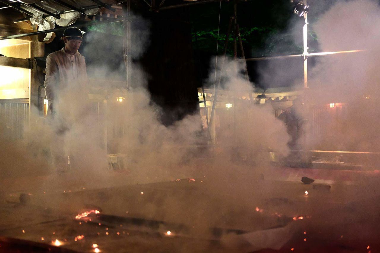 Lighting the custom-made fireworks to complete the creation. Depicted is a dedication ceremony in Echizen for the lighting of the picture. (Photo courtesy of Yamaguchi Kazuya)