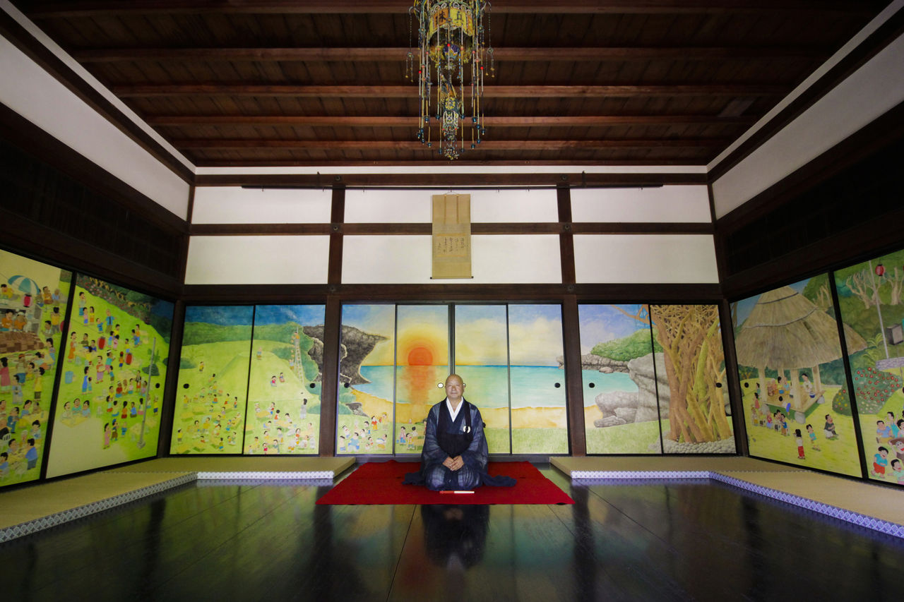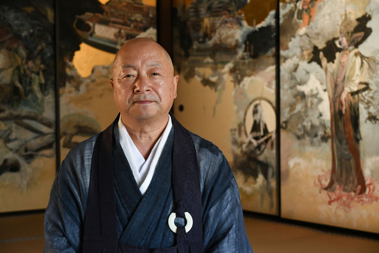 Yamada Sōshō, the twenty-seventh superior of Shinjuan, seated before the fusuma illustration by Kamikokuryō Isamu, art director for the Final Fantasy video game series. (© Tsunoda Ryūichi)