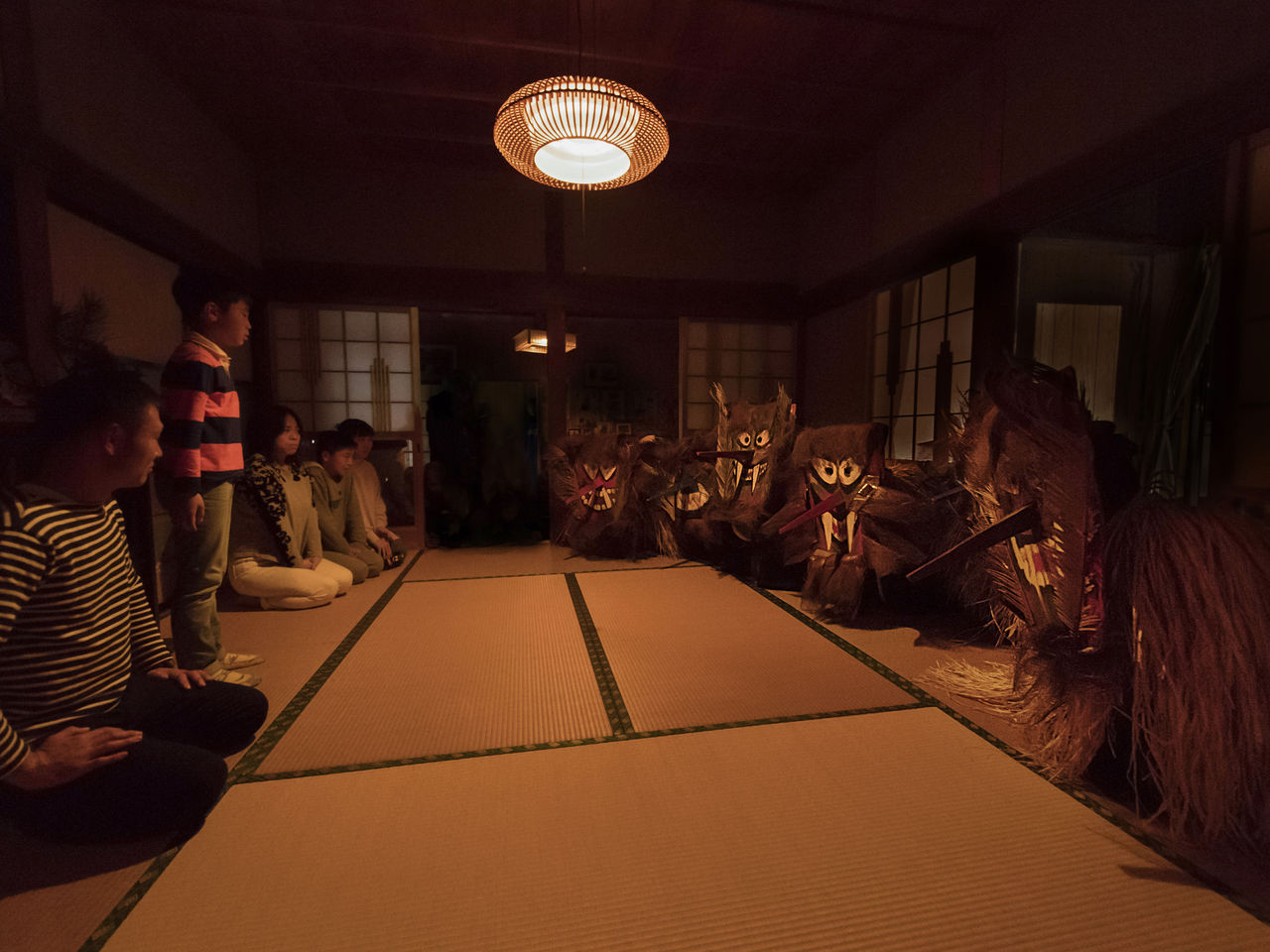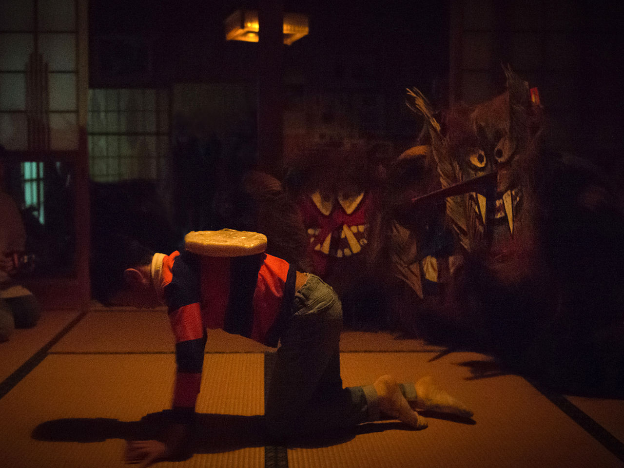 Though specific appearances vary from one place to the next, the participants all wear oni devil masks made of such materials as Chinese windmill palm husks, sago palm leaves, and paper, and cover their bodies with capes or rain ponchos made of straw. Then they enter a given house with a shout of “Hey! Is so-and-so home?! Come and open the shōji screens!”
