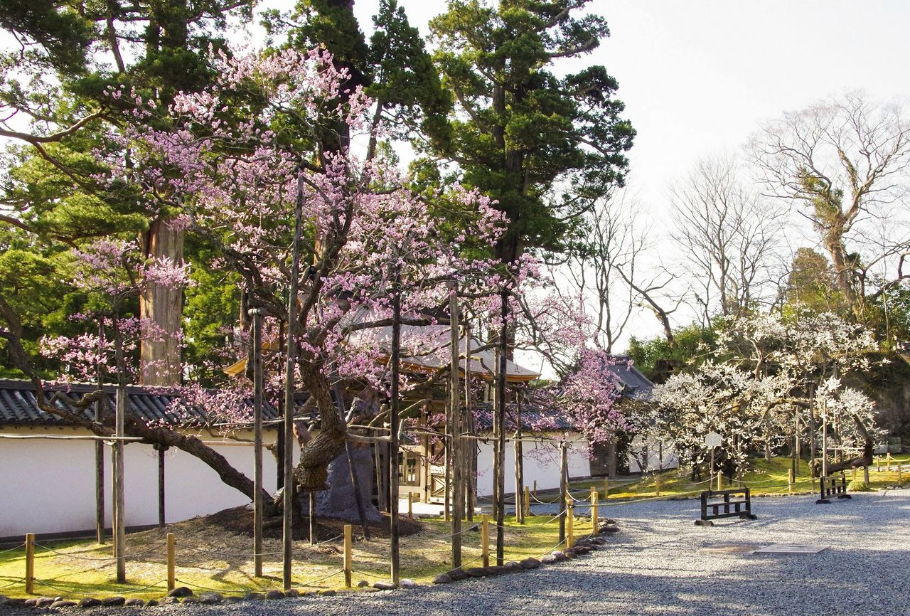 The ancient Garyūbai plum trees add splashes of pink and white to the temple’s front garden. (Photo courtesy of Zuiganji)