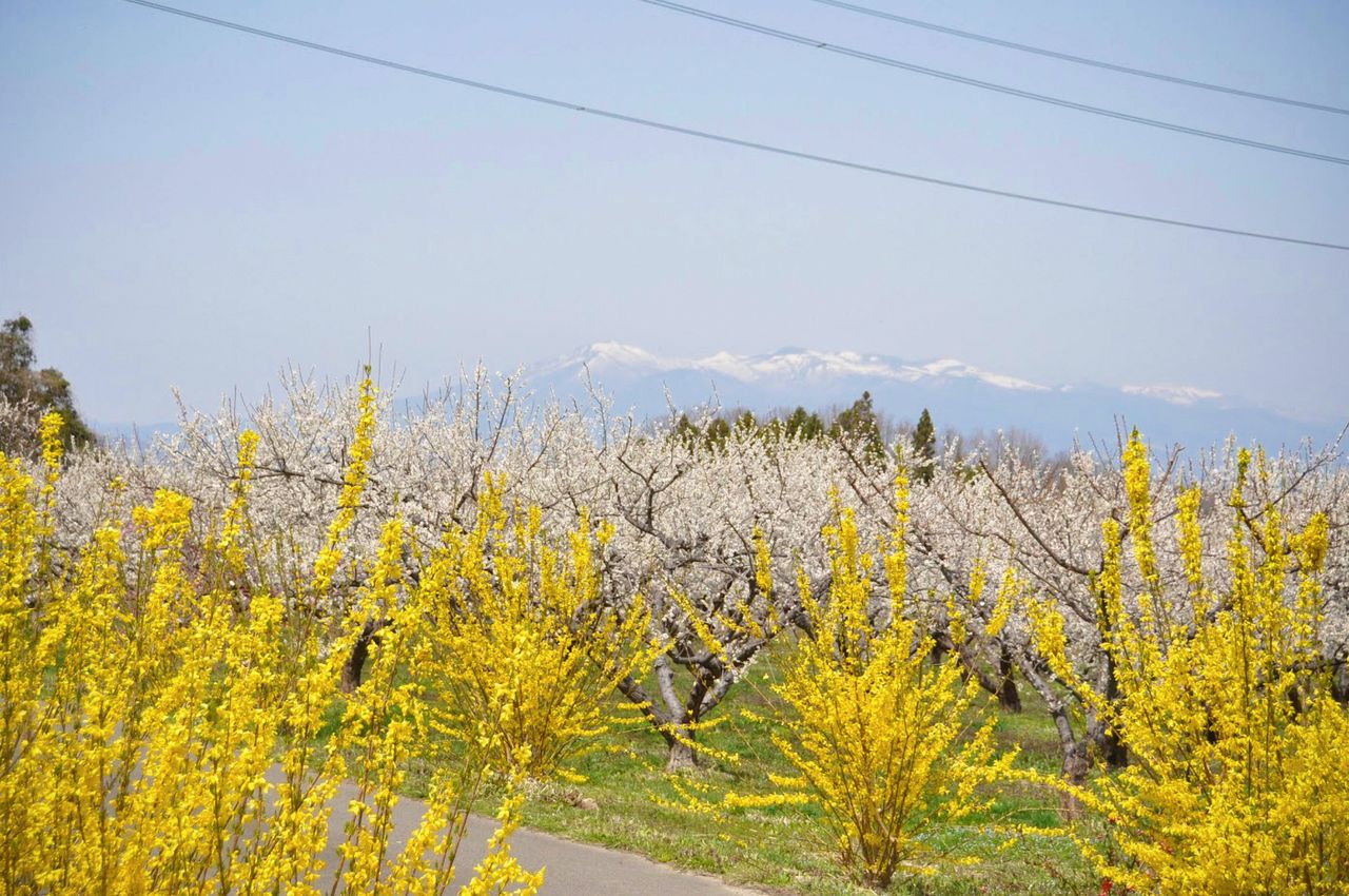 Residents of the Nishida district in Kōriyama, Fukushima Prefecture, have been planting plum trees for the past three decades as part of a campaign to beautify the city. The now-famous Plum Road is lined with nearly 12,000 plum trees. In spring, their delicate pink and white blossoms are a pleasing sight against the backdrop of snow-capped Mount Adatara. The combination of the pink and white plum blossoms and the bright yellow of the forsythia and canola that bloom at the same time transforms the area into a beautiful Shangri-La. Also to be enjoyed is the occasional birdsong of the bush warbler.