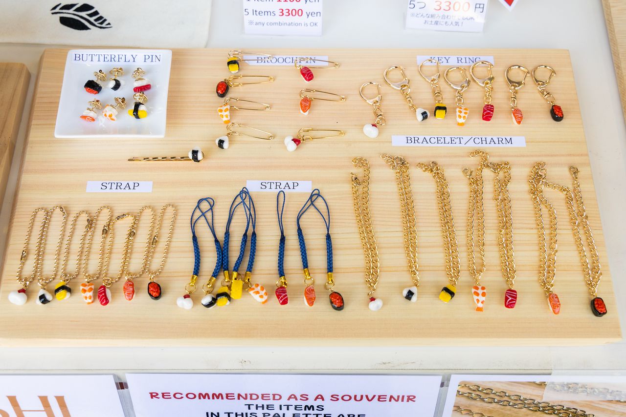 Small items like keychains run ¥1,100 each or five for ¥3,300, so bulk buying is common. (© Nippon.com)