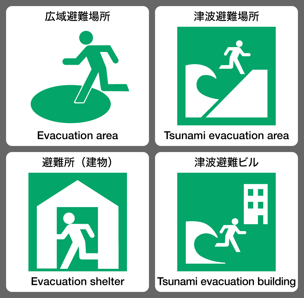 Evacuation areas (hinan basho): These are places where people can go to get away from the immediate danger of the effects of disasters, such as fires or collapsing buildings. Typically, they are in locations like parks or sports fields. In areas near the sea or rivers, where there is a tsunami risk, evacuate at once to higher ground or the upper floors of solidly constructed buildings.