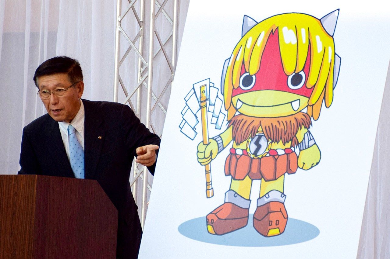 Akita Governor Satake Norihisa introduces Ndatchi, the prefectural mascot, a robot in the form of a namahage child who has come from the future to spread the word about Akita’s charms. (© Jiji)