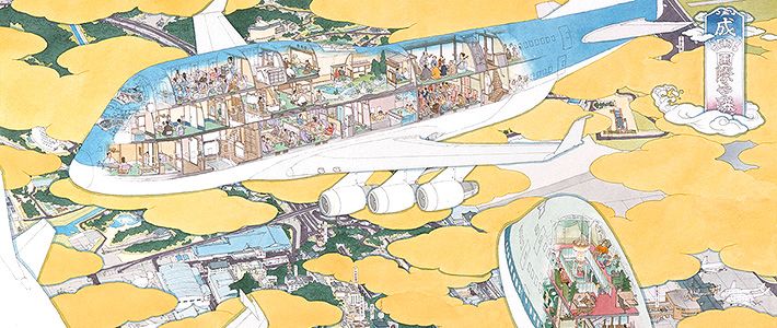 At first glance it looks like a traditional Japanese painting. But a closer look at the details reveals a brilliantly conceived world where past, present, and future intermingle: a captivating and elaborately composed imaginary world that captures the viewer’s imagination.