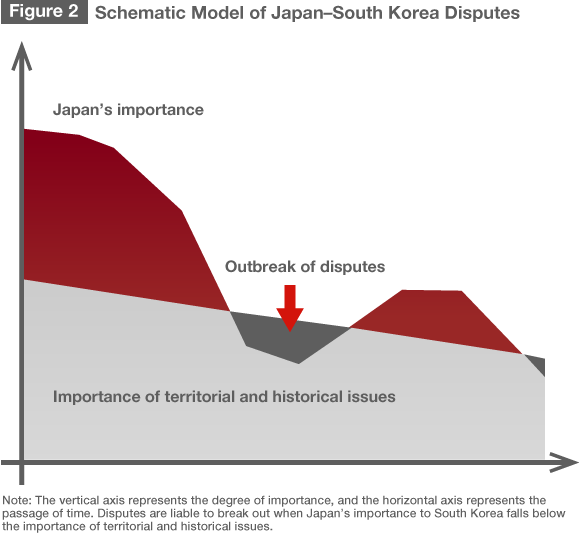 What is significant is that the circumstances of South Korea changed substantially during the interval between the two Abe administrations—and in particular that Japan’s importance to South Korea waned greatly. This increases the likelihood of frequent flaps over bilateral issues like historical perceptions and the territorial issue. The easiest way to understand this is probably with a model like the one I present in figure 2. The importance of the historical and territorial issues for South Korea has tended to decline with the passage of time. The colonial era is receding into the past, and as the country’s society has matured, the objects of public interest have diversified. This is why the numbers of participants in anti-Japanese activities have been shrinking inexorably over the long term.