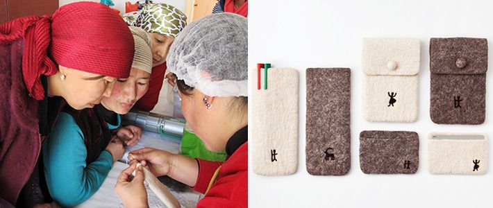 (Originally published in Japanese on August 26, 2014. Title photos: Members of the “One Village, One Product” cooperative in Kyrgyzstan making felt goods for Muji stores [left]; felt mobile phone cases and other products sold globally through Muji in 2013. Photos courtesy of Ryōhin Keikaku.)