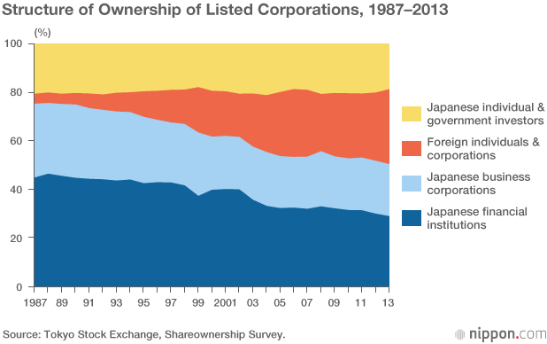 The first is a long-term shift in the ownership structure of listed companies, illustrated below. The share of stock owned by foreigners (corporations and individuals) rose from a mere 4% in 1987 to 30.8% in 2013, while the share controlled by Japanese financial institutions and business corporations fell substantially.