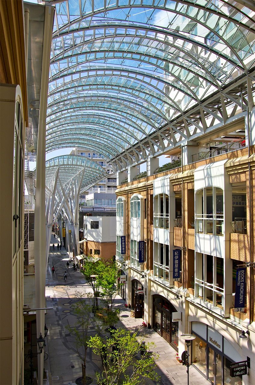 The shopping district continues for 470 meters south from the square and consists of seven blocks, marked A through G. Blocks A to C and G have been largely redeveloped, with buildings on both sides of the shopping streets being jointly replaced as needed and covered with a glass arch above the third story. The height of the arcade covering is 22 meters, twice that of the previous roof.