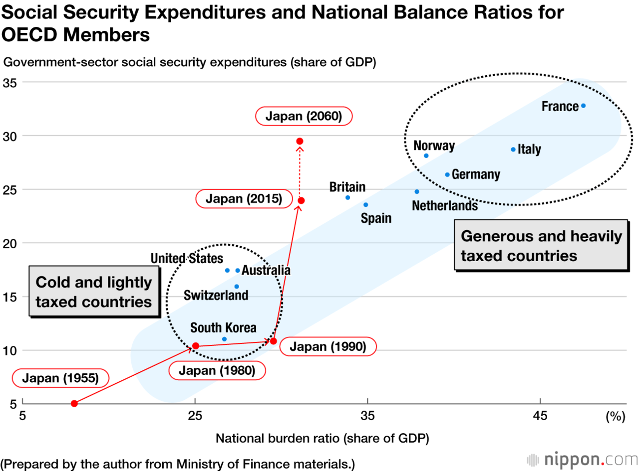 First, a national conversation is needed on benefits and burdens. The figure below, which compares the taxpayer burden and the size of social security expenditures of OECD member nations, reveals a distinct trend. Countries with large social security expenditures have a large taxpayer burden, and countries with small social security expenditures have a small taxpayer burden.