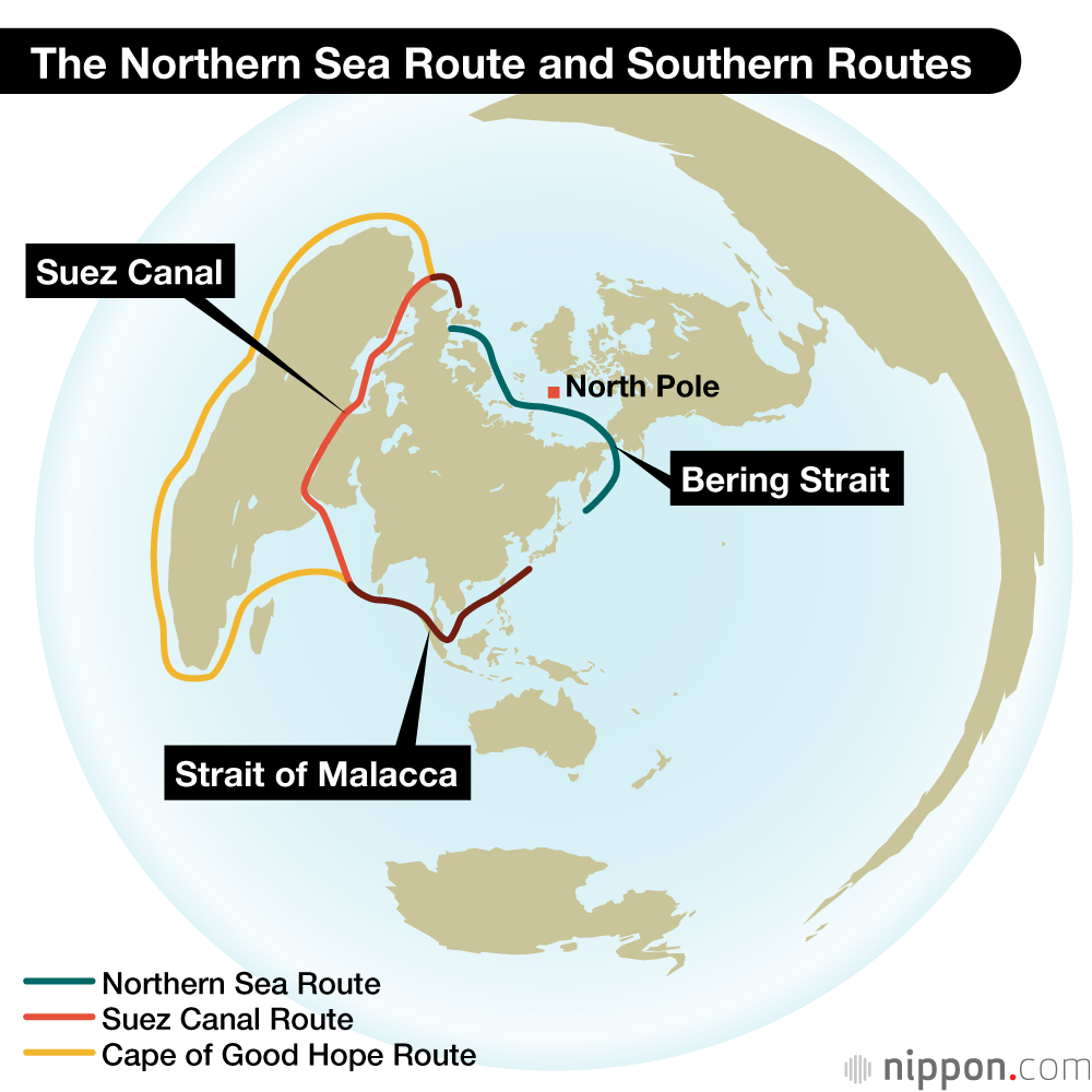 Russia has recently begun touting the Northern Sea Route as a third option. The route passes through the Arctic Ocean off the northern coast of Russia, and is said to reduce the distance to London by 60%. It is currently only open when the sea ice melts in warm weather, but Russia is building an ice breaker fleet to help keep it traversable year-round.