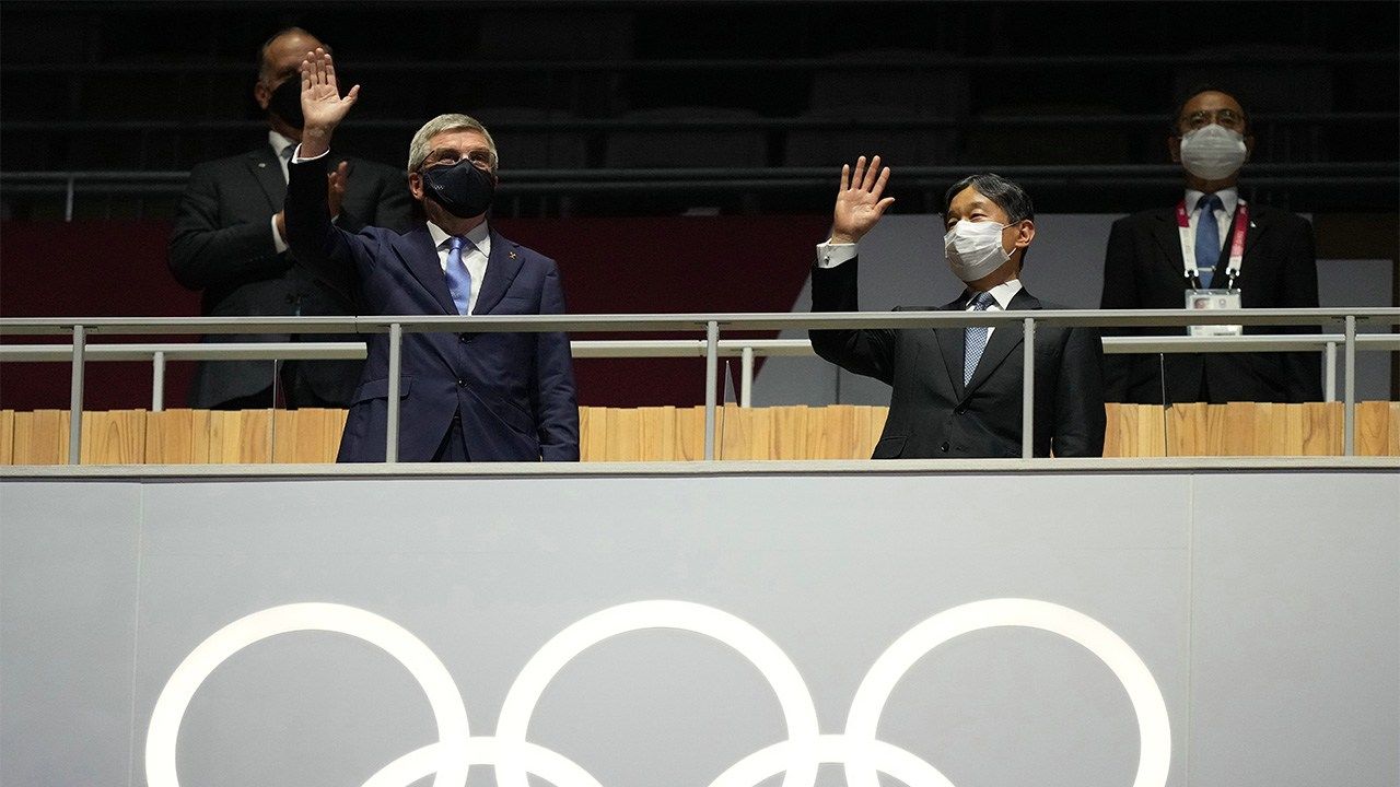 Emperor Naruhito, at right, waving at the opening ceremony of the Olympic Games alongside Thomas Bach, president of the International Olympic Committee, on July 23, 2021. (© Jiji)