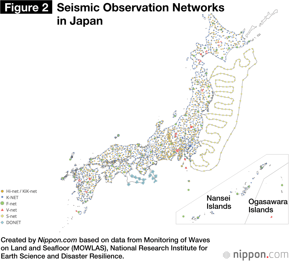 The 1995 Kobe earthquake spurred major revision of the existing system, with the realization that it was crucial to understand contemporary seismic activity and movement of the Earth’s crust. Japan’s fundamental observation network comprised two nationwide systems: Hi-net, the High Sensitivity Seismograph Network Japan, operated by the National Research Institute for Earth Science and Disaster Resilience, with around 800 stations, along with several other seismic networks (figure 2); and the Global Navigation Satellite System’s GNSS Earth Observation Network System, or GEONET, under the Geospatial Information Authority of Japan, with roughly 1,300 stations.