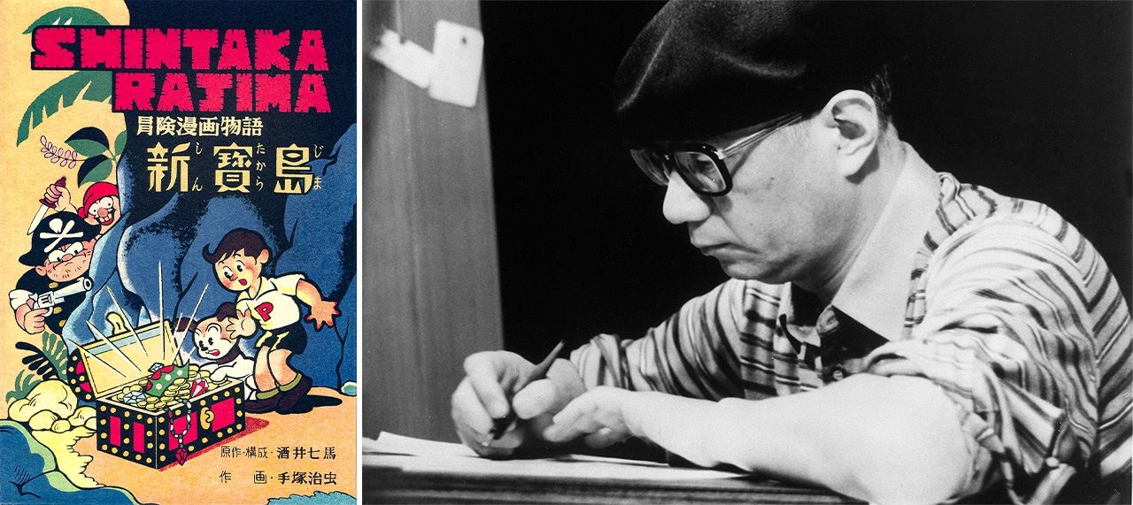 A Japanese edition of Shin Takarajima (New Treasure Island), at left, with art by Tezuka Osamu and story and composition by Sakai Shichima (© Nippon.com); at right, Tezuka Osamu at work. (© Jiji).