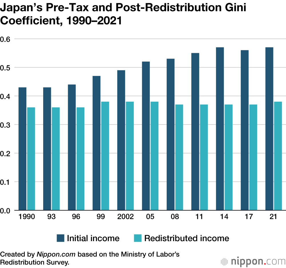 According to the Income Redistribution Survey conducted by the National Institute of Population and Social Security Research, Japan’s pre-tax Gini coefficient, measuring inequality in initial (or market) income, has been growing. But the coefficient for disposable income following redistribution has remained virtually unchanged since 1990. Most of this redistribution occurs through government spending on healthcare, pensions, and other social benefits.