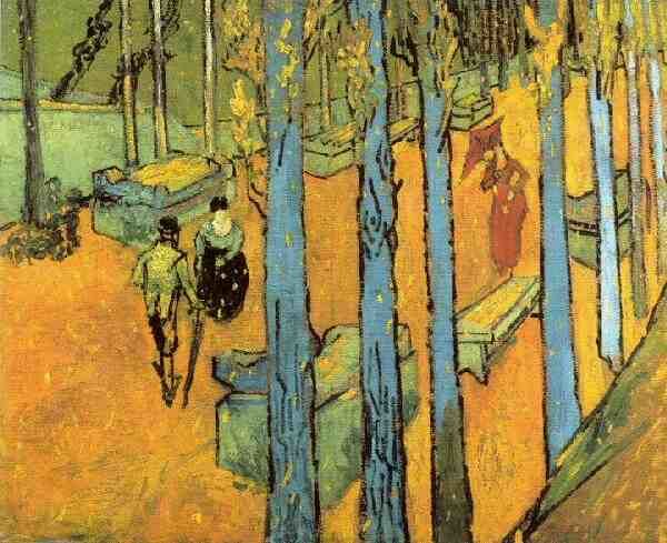 Van Gogh’s Falling Leaves (Les Alyscamps), above (1888, © Kröller-Müller Museum), deliberately excludes the sky and places the row of poplars prominently in the foreground. His treatment of the avenue, making use of the straight vertical lines of the trunks, resembles a compositional approach favored by the ukiyo-e artist Utagawa Hiroshige, below, whose similar composition can be found in Yoshitsune ichidai zue (Illustrated Guide to the Life of Yoshitsune) (c. 1834–35, courtesy ColBase).