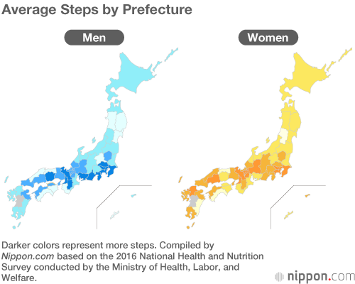 The National Health and Nutrition Survey compared the average number of steps by prefecture. Osaka ranked highest for men and Kanagawa for women, with Kōchi having the lowest tally for both men and women.