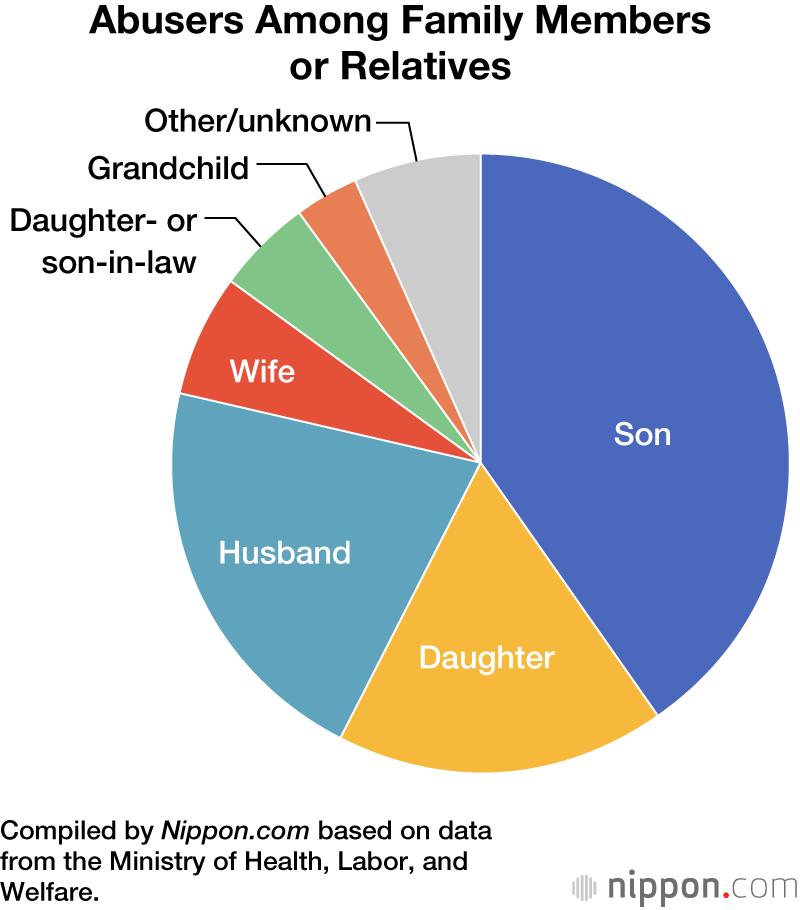 Among the elderly victims of abuse, 76.1% were women and 23.9% men. The overwhelming perpetrators of the abuse were sons, at 40.3%, followed by husbands at 21.1% and daughters at 17.4%. The following main reasons for abuse were cited in the MHLW survey (multiple answers allowed): exhaustion and stress from caring for the elderly (24.2%), mental issues of the abuser (21.8%), personal problems with the victim prior to abuse (14.2%), dementia of the victim (13.7%).