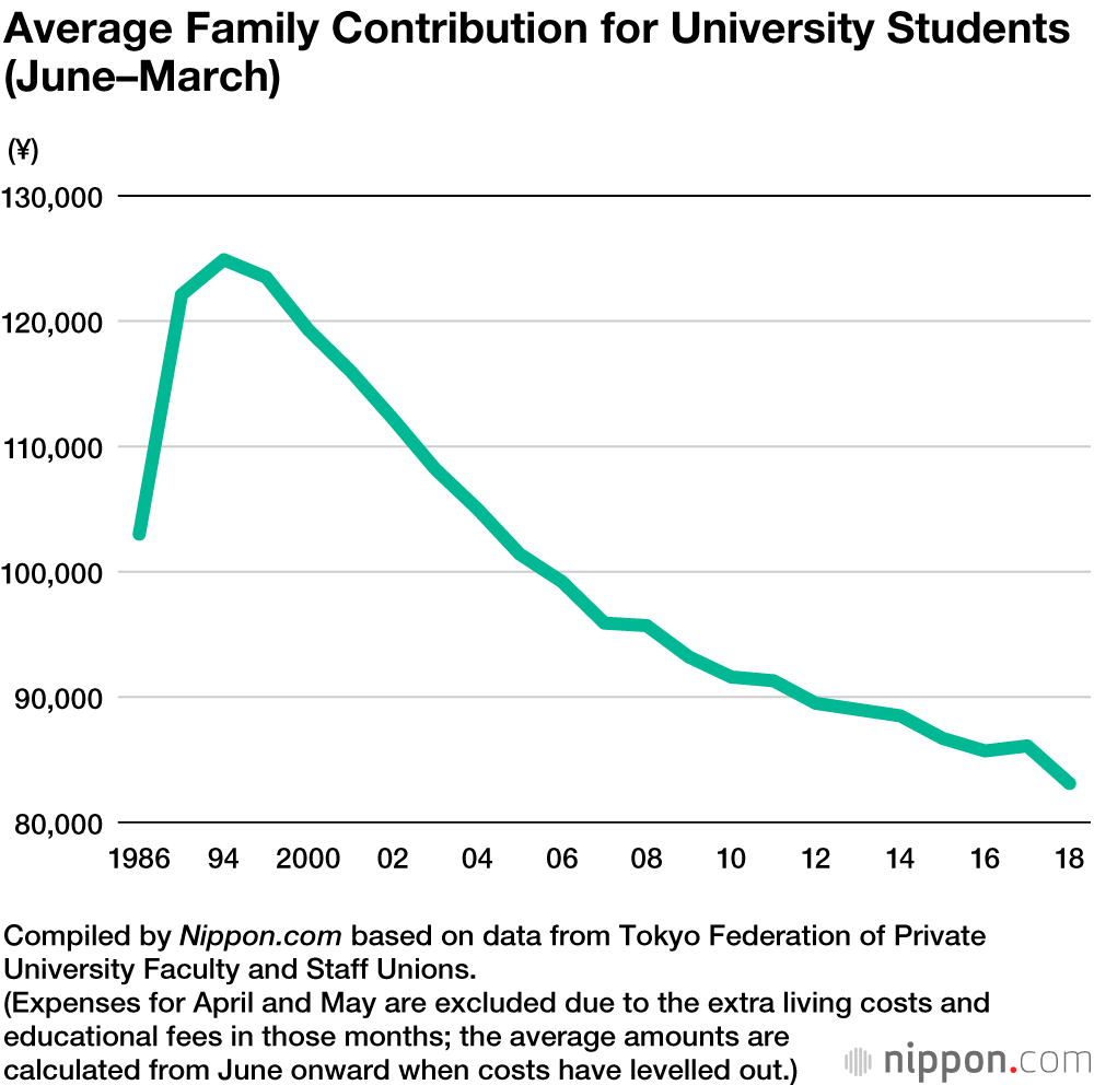 Private university students in Tokyo are increasingly needing to get by on less. A 2018 survey by the Tokyo Federation of Private University Faculty and Staff Unions found that the average financial support sent by parents to new students boarding at private universities in the capital dropped by ¥3,000 from the previous year to ¥83,100. This marked the lowest amount of family input recorded since the survey began in 1985.
