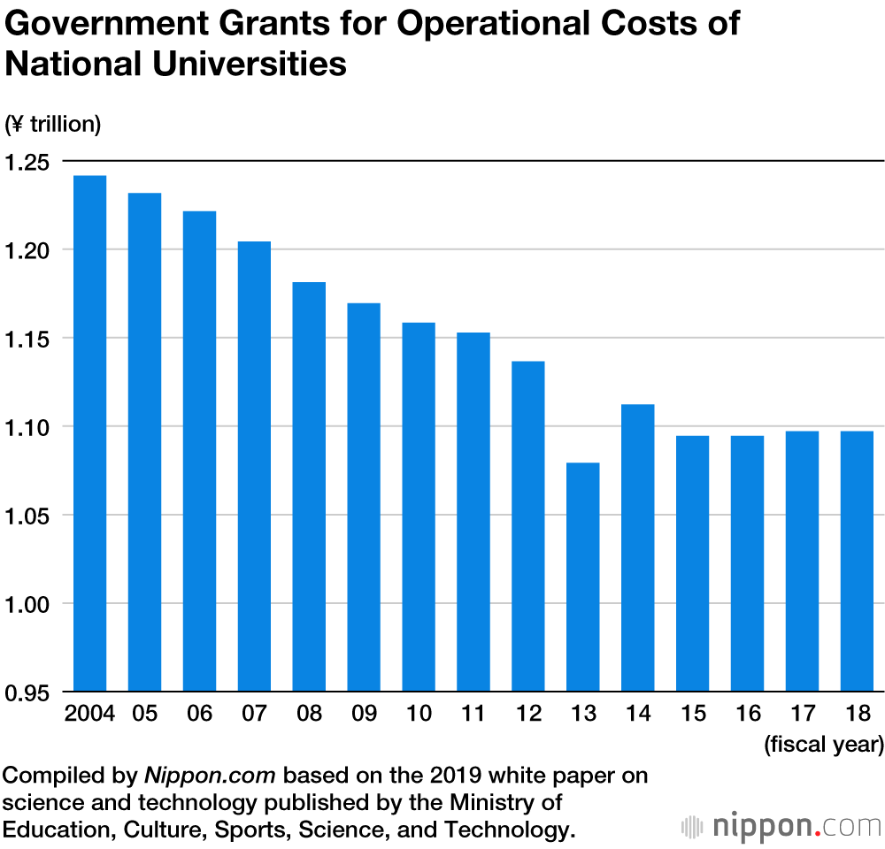 Underlying the stagnation in basic research is the worsening environment for national universities. According to the white paper, the subsidies provided by the government to national universities to cover operational costs were 11.6% lower in fiscal 2018 than in fiscal 2004, and this level has remained basically unchanged over the four years leading up to fiscal 2018. In addition, the amount time university professors in the sciences dedicate to research among their overall work-related time fell from 56.9% in 2002 to 51% in 2013. Meanwhile, the amount spent by professors on educational activities rose from 20.5% to 22.7% between those same two years, revealing how the additional hours spent on student guidance are cutting into time available for research.