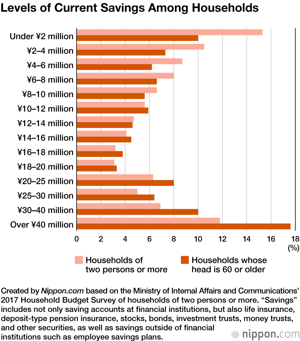 Average savings among all households of two or more persons surveyed was ¥10.7 million, but the average was 1.5 times higher, or ¥16.4 million, for households whose head was 60 or older. The percentage of those whose current savings are ¥40 million or more was also quite high, at 17.6% among those 60 or older and 11.8% among all households surveyed.