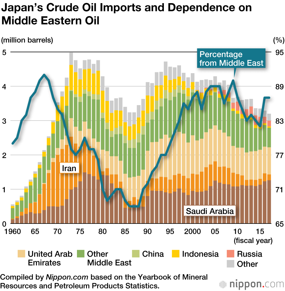 In fiscal 2017, 87% of Japan’s imported oil came from the Middle East, predominantly Saudi Arabia and the United Arab Emirates. Over 80% of this is transported by tanker through the Strait of Hormuz.