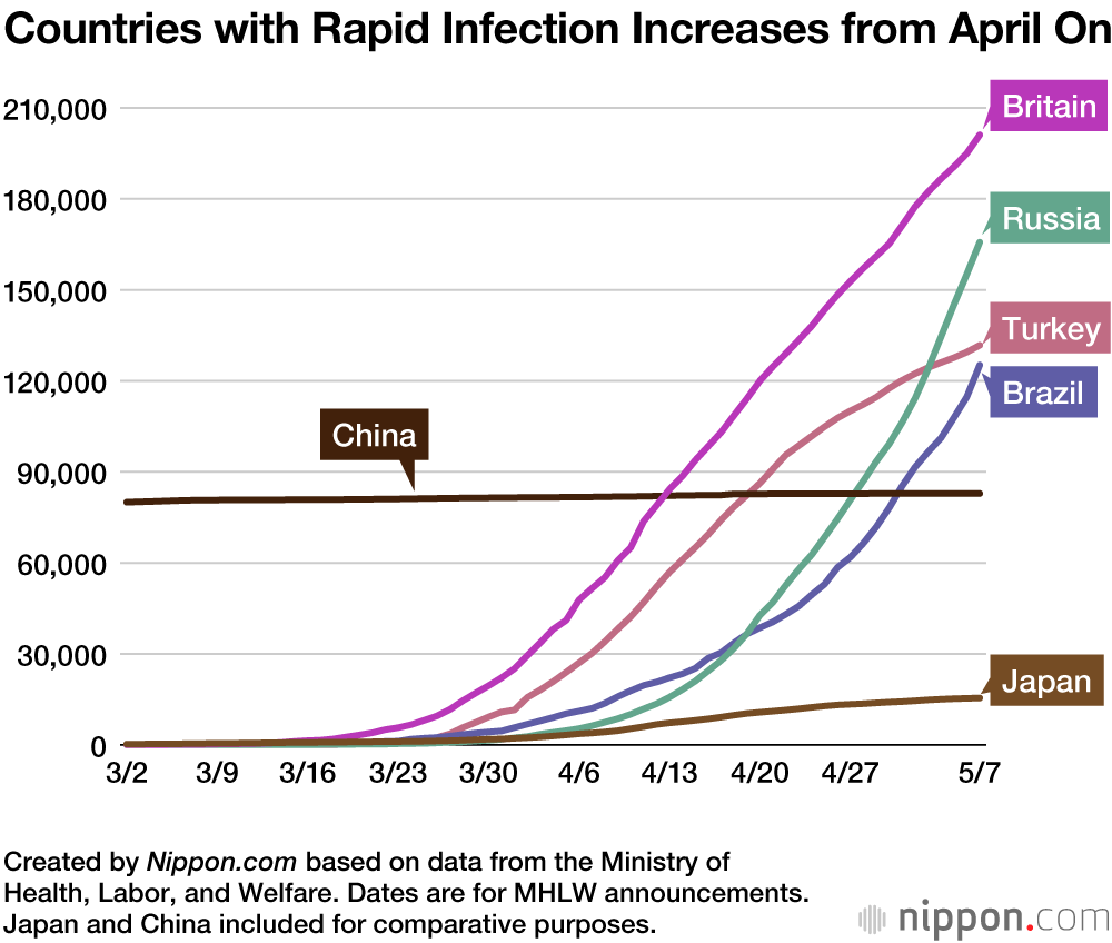 Today’s Ministry of Health, Labor, and Welfare report shows that India now has almost 250,000 cases, the fifth highest worldwide, ahead of Spain and Italy.