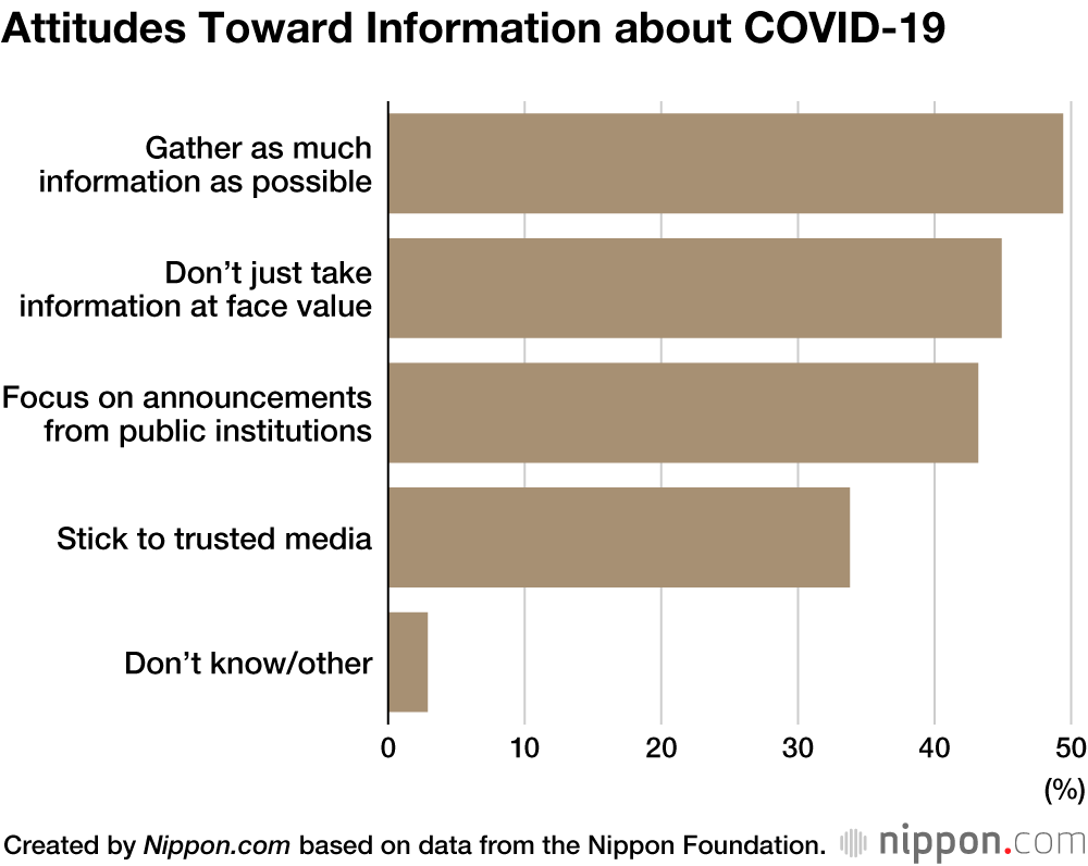 Of the people surveyed, 81.3% were actively trying to gather information regarding infectious diseases. When asked about their attitude to information, the main response (49.4%) was that they were trying to gather as much information as possible and more than 40% didn’t just accept information at face value, but rather depended on announcements from public institutions. This indicates that late teens are taking care not to be swayed by fake news.