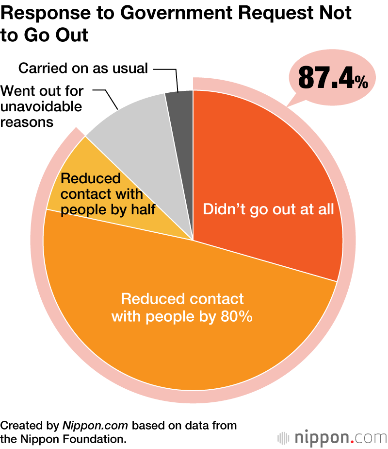 From April 21 to 23, The Nippon Foundation carried out a survey targeting 1,000 people aged from 17 to 19. The results revealed that 87.4% of late teens are following government and local authority requests to refrain from going out. This percentage included those who did not go out at all.