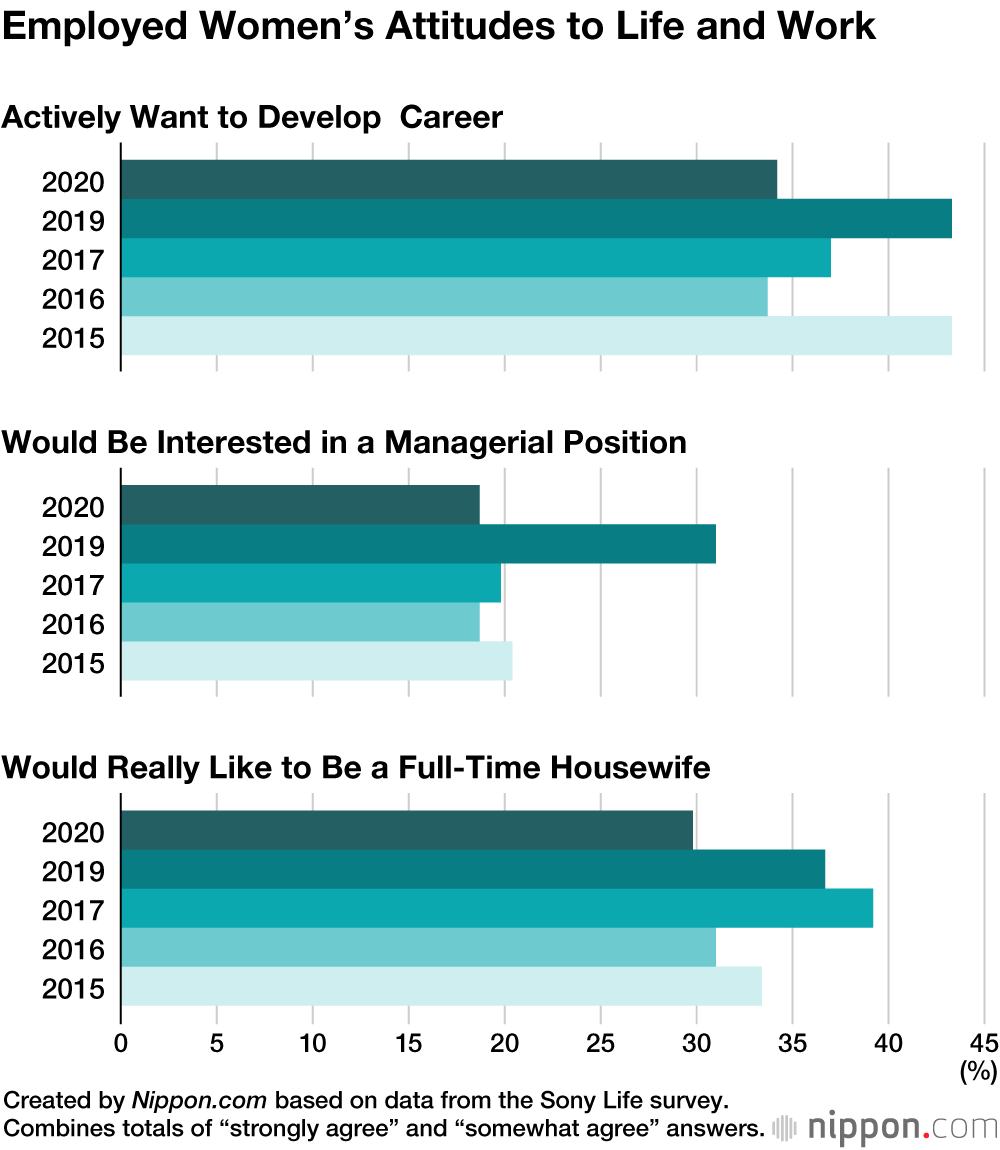 A 2020 survey by Sony Life Insurance shows a substantial drop over the previous year in the ratio of women who “actively want to develop their career” and who “would like to pursue a path to a managerial position.”