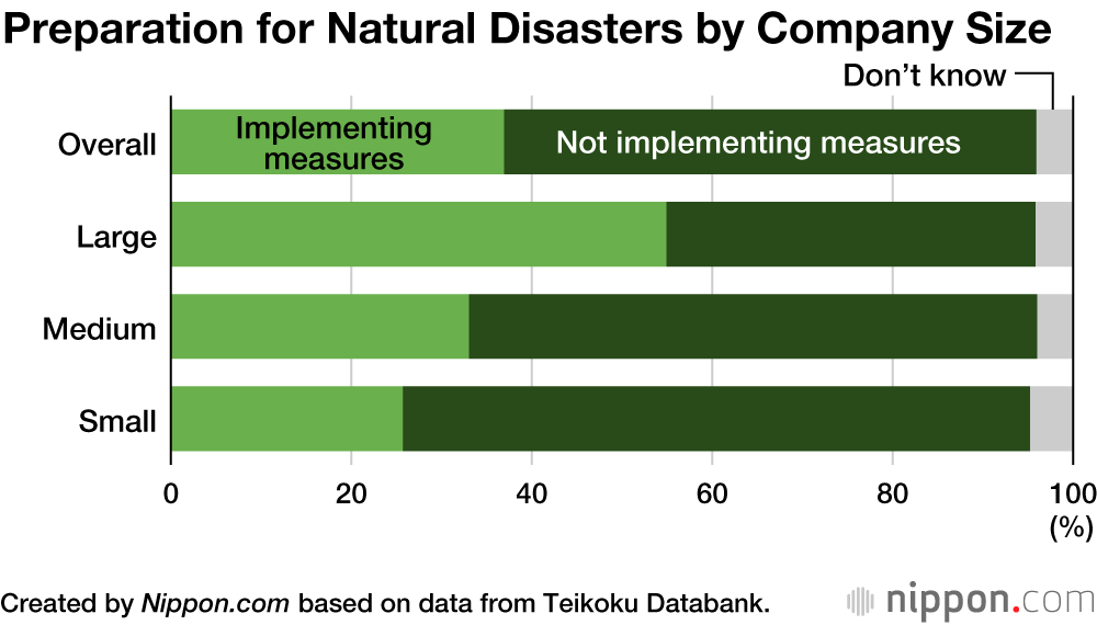 Japan is a nation beset by many natural disasters, including earthquakes, typhoons, and volcanic eruptions. Teikoku Databank surveyed 23,695 companies regarding whether they were taking measures to prepare for such disasters and of the 11,448 that gave valid responses, 36.9% said that they were in the process of implementing them. A greater proportion of large companies were making preparations at 54.9% compared to 33.0% of medium and 25.7% of small companies. Among the comments, a cardboard manufacturing company in Aichi Prefecture stated that while it knew taking measures was necessary, it did not have the staff or time, so it was difficult to implement.