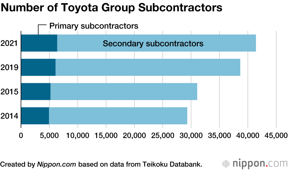 Toyota Motor Group, which includes 15 major affiliates and subsidiaries, has 41,427 subcontractors, including 6,380 primary subcontractors that deal directly with the company, and 35,047 secondary subcontractors that deal indirectly through the primary subcontractors. This is the finding of a survey conducted by Teikoku Databank, the fourth of its kind, in which the total number of subcontractors exceeds 40,000 for the first time.