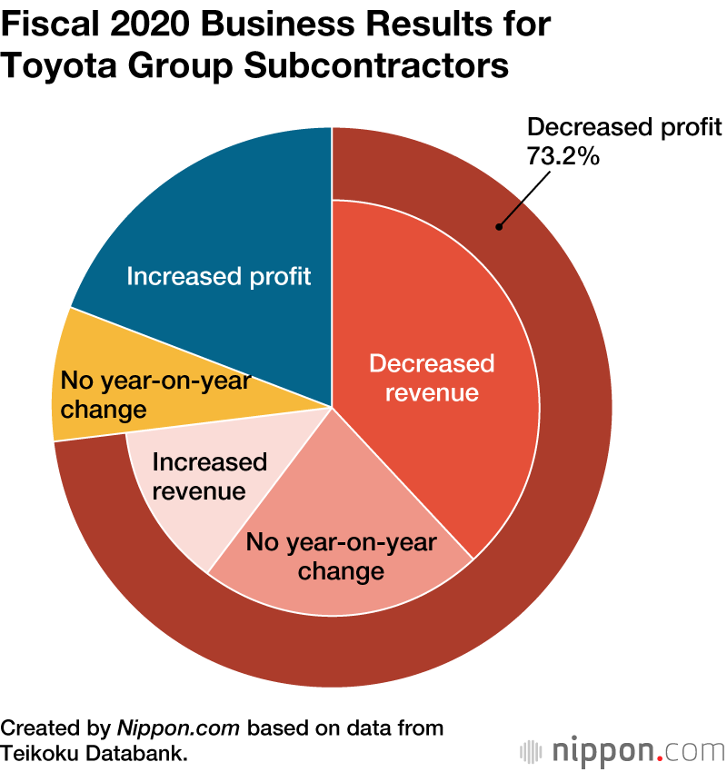 In fiscal 2020, 18,718 of the 25,000 Toyota Motor Group subcontractors surveyed, or 73.2%, reported a decrease in sales. In fiscal 2019, there was an even split between increased and decreased sales, at around 40% each, but the following year sales were negatively impacted by the rapid fall in automobile demand due to the global COVID-19 pandemic. Sales in the market for new cars subsequently began to recover, but it was not enough to rebound from the drop in sales at the beginning of the fiscal year.