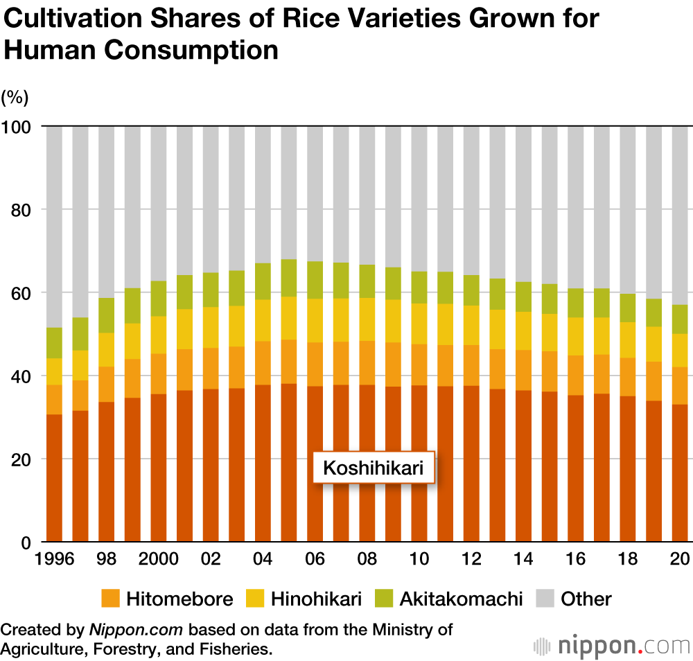 Koshihikari is representative of delicious rice. The variety has held top position as the staple rice in Japanese meals since 1978. From 1996 through 2019, it accounted for 30% of rice for human consumption grown in Japan, far ahead of other varieties. Hitomebore, Hinohikari, and Akitakomachi have held second through fourth place, respectively, since 1999 and together, these four varieties account for 60% of the total. Incidentally, the three varieties vying for second place were all created by cross-breeding Koshihikari with other varieties, which shows the strength of its “family.”