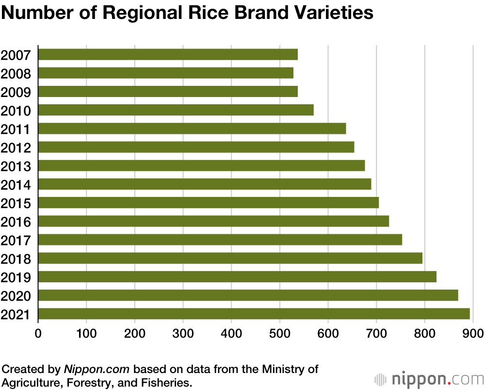 This trend for brand diversification can also be seen in the number of regional brand varieties in rice-producing areas. The Ministry of Agriculture, Forestry and Fisheries set specifications that the production area and brand name should be displayed on the rice bags, so for example “X-region-produced Koshihikari” or “Y-region produced Akitakomachi”. This has led to a continuous increase in the number of nonglutinous rice brands over the last 13 years, reaching 893 for the rice produced for 2021s.