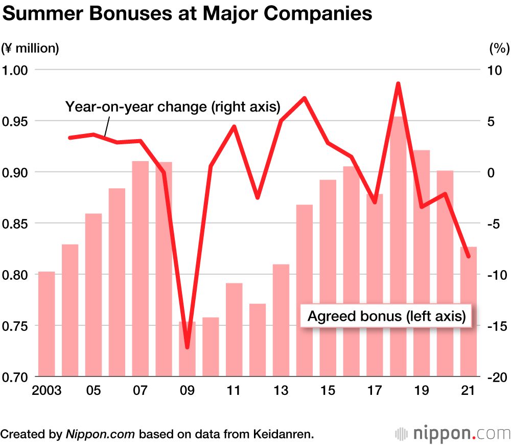 Created by Nippon.com based on data from Keidanren. Does not include all sectors, as some companies have been excluded from the total due to average amounts being unknown.