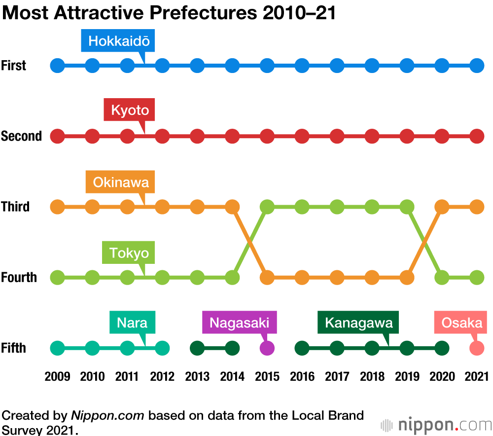 Hokkaidō remained comfortably on top as Japan’s most attractive prefecture in the Local Brand Survey 2021, conducted by the Brand Research Institute. It has been number one every year since the survey started covering prefectures in 2009. Hokkaidō also came highest in categories on tourism and brand recall for regional food products. Meanwhile, Kyoto has been in second place for 13 consecutive years. The ranking saw little change at the top in 2021, although Osaka leapfrogged Kanagawa to move into fifth place, and Nagasaki rose to enter the top 10.