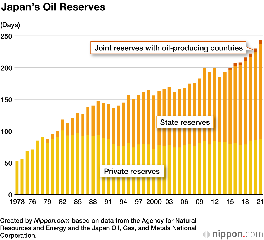 As of September 30, 2021, Japan’s state reserves held oil equivalent to 145 days’ consumption (44.6 million kiloliters), while private-sector reserves held 90 days’ worth (27.7 million kiloliters), and joint reserves with oil-producing countries had 6 days’ worth (1.9 million kiloliters). This adds up to 241 days’ worth of oil overall.