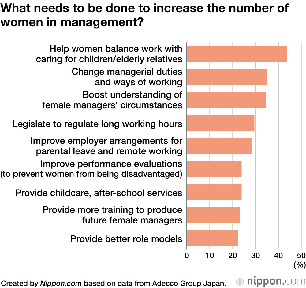 When asked what needed to be done to increase the number of women in management, the most common response at 43.8% was “help women balance work with caring for children/elderly relatives,” followed by “change managerial duties and ways of working” at 35.1%, and then “boost understanding of female managers’ circumstances” at 34.6%.