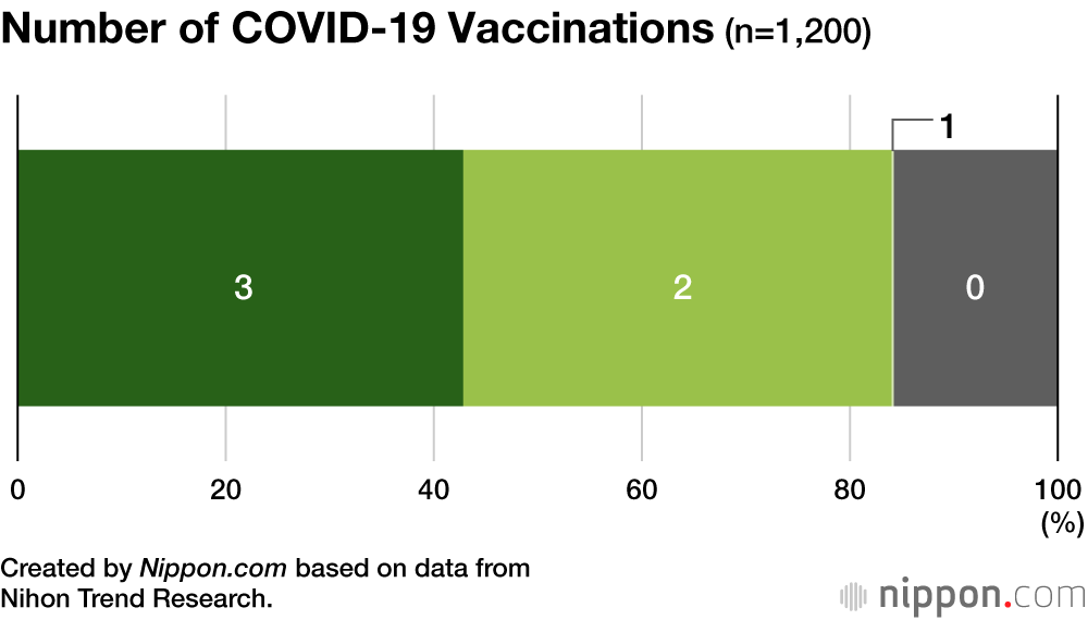 Nihon Trend Research conducted a survey from late March through early April, asking 1,200 people across Japan about COVID-19 vaccinations. It found that 42.9% of all respondents had received their third dose. A further 41.2% had been given their second dose and 0.2% only the first one, whereas 15.8% had not been vaccinated at all.