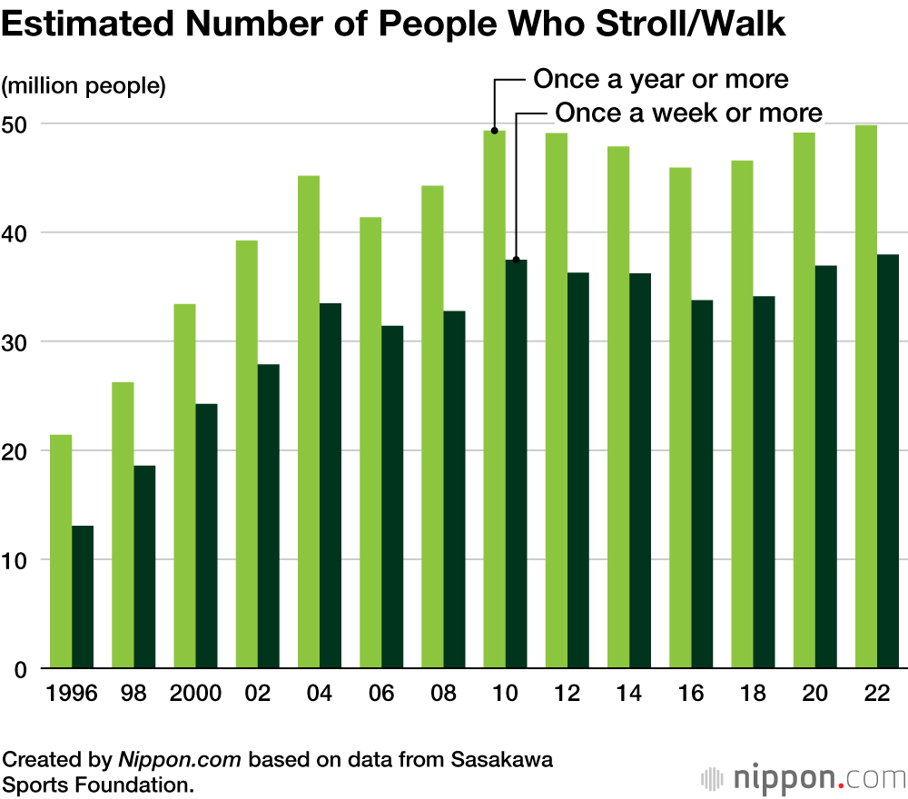 The percentage of people in Japan who went for a stroll or did some walking at least once in 2022 was 48.3%, equating to an estimated 49.8 million people. This was according to a survey looking at people’s sports habits, which is conducted regularly every two years by the Sasakawa Sports Foundation. Those who went walking at least once a week and not just when they felt like it or because they were about to have a health check accounted for 36.8%, meaning an estimated 38 million of the population. In 1996, it was 13.6%, or an estimated 13.1 million, indicating both the rate and estimated number of people have nearly tripled over the past twenty-six years.