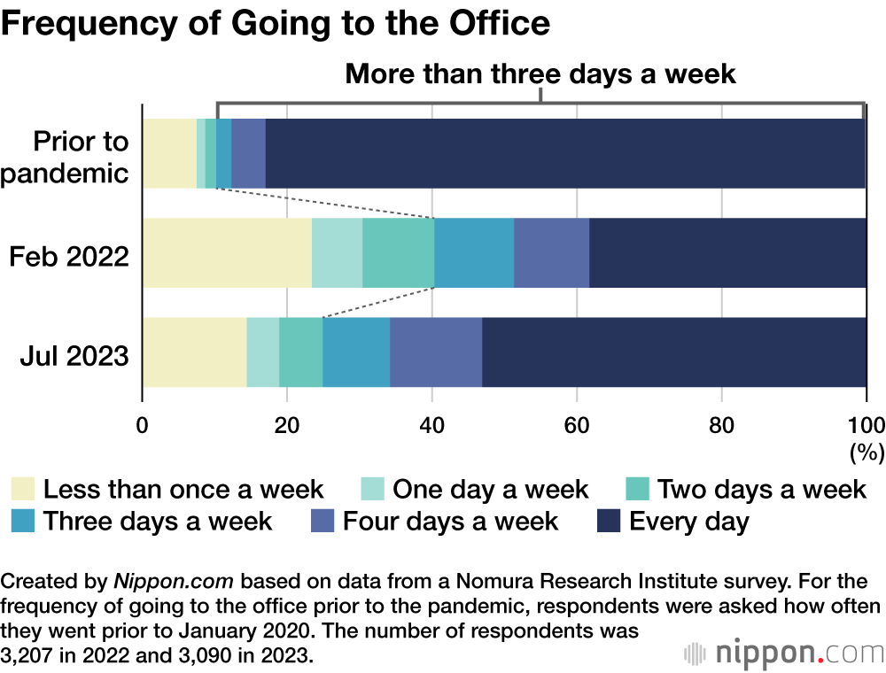Nomura Research Institute conducted a survey looking at Tokyo employees’ work styles and their intention to relocate to the suburbs or out of the city entirely. The results revealed that, as of July 2023, 53.1% went to the office every day, 12.7% four days a week, and 9.3% three days a week. This adds up to 75.1% of employees going into the office three or more days a week. At the time of the last survey in February 2022, when Tokyo was still in the final phase of COVID-19 restrictions, 59.7% answered three or more days a week, so there has been a clear rise in the number of employees returning to the workplace rather than working from home.