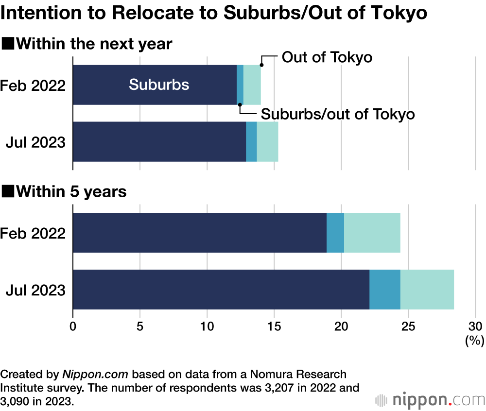 Respondents were also asked about their interest, or intention, to relocate to the suburbs or out of the Tokyo area entirely. This showed that 15.3% of all respondents were thinking to relocate “within the next year” and 28.4% “within five years.” Both figures were a slight rise from the previous survey. It indicates that even though people are moving back toward working in the office, their desire to relocate to the suburbs or further afield remains undiminished.