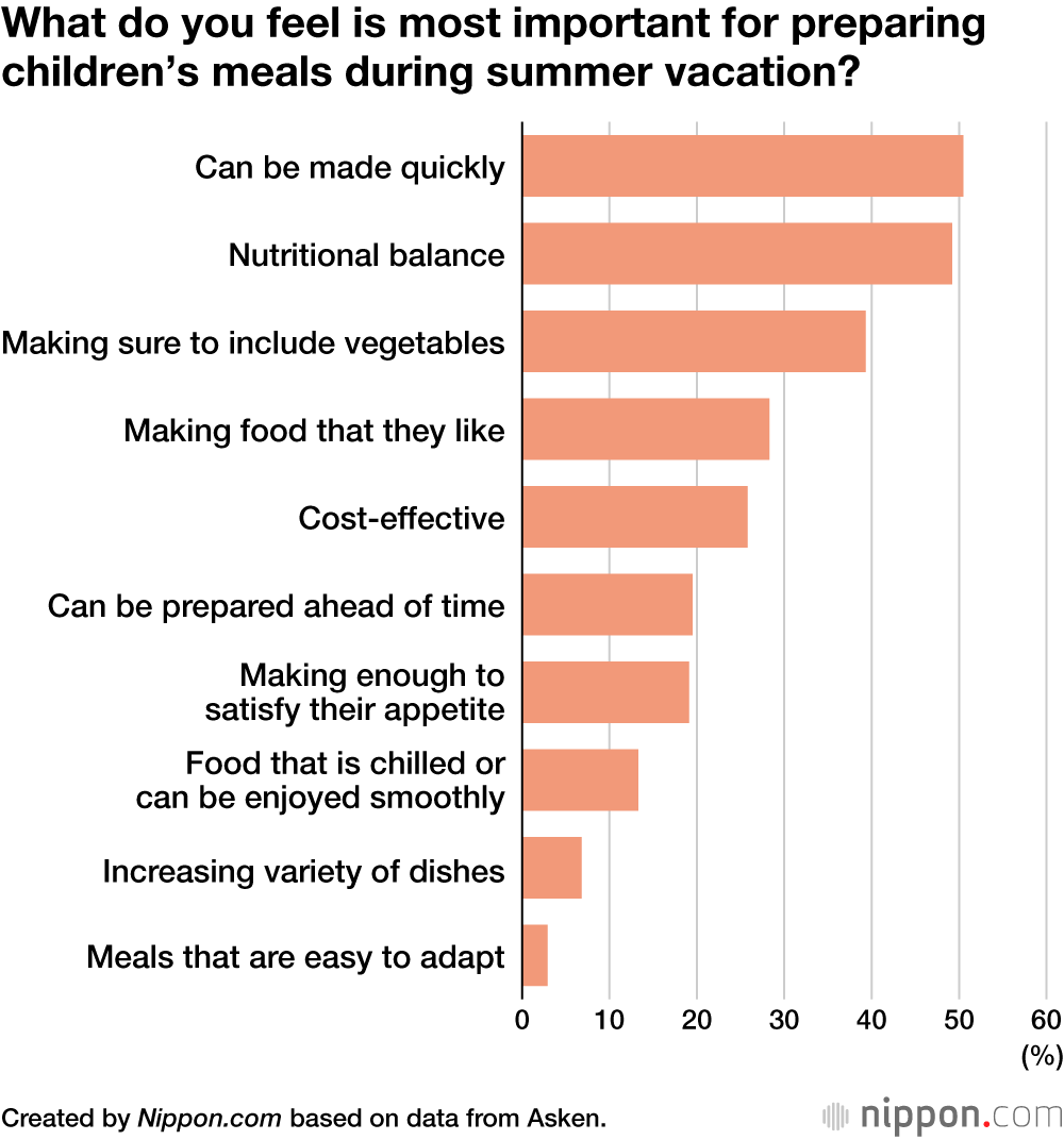 At 50.5%, parents placed greatest importance on providing meals that “can be made quickly.” In the case of parents in employment, their issue was how best to prepare the meals before leaving for work. This was closely followed by 49.2% who focused on “nutritional balance,” while “making sure to include vegetables” also ranked high with 39.3%.