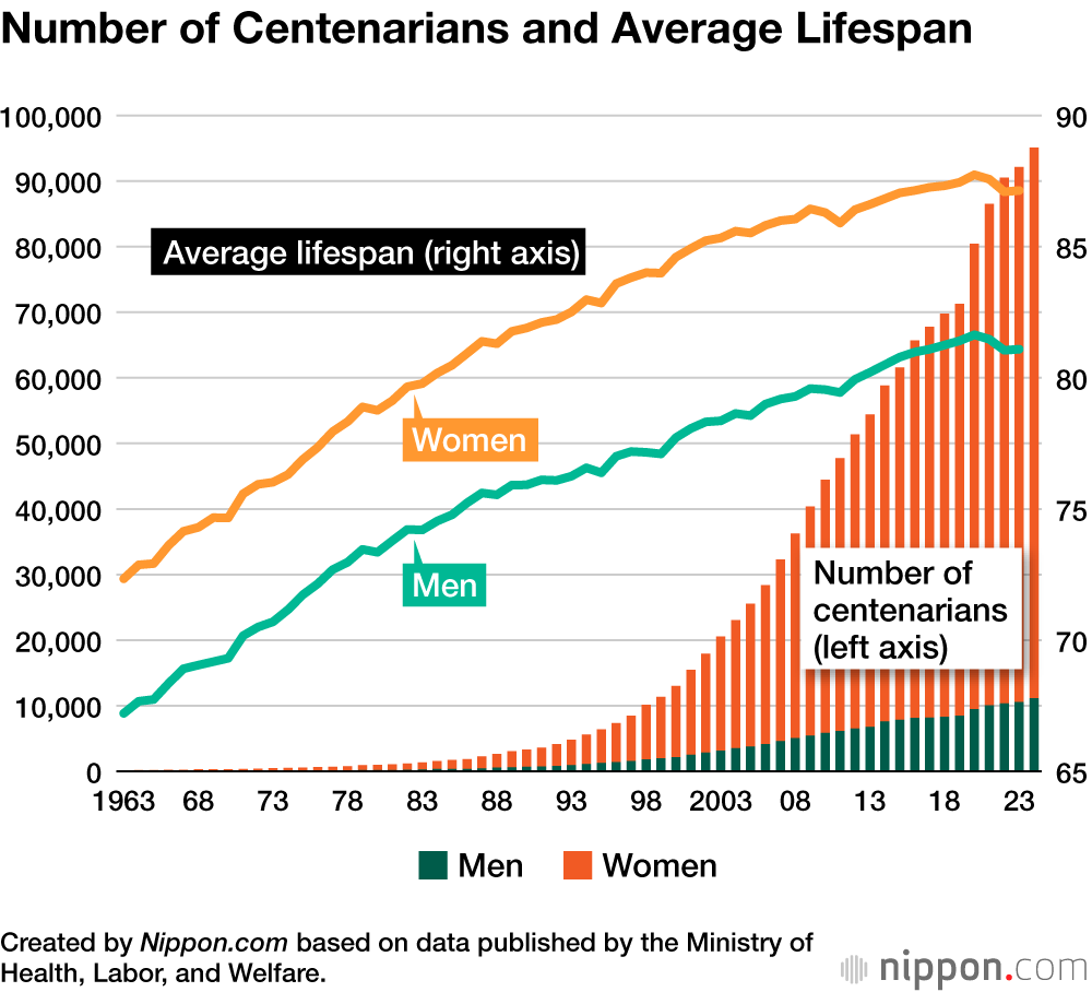 In 1963, when the government enacted the Act on Social Welfare for the Elderly, there were 153 Japanese centenarians nationwide. That figure surpassed 1,000 in 1981 and topped 10,000 in 1998, and has since continued to rise by a 10,000 every few years.