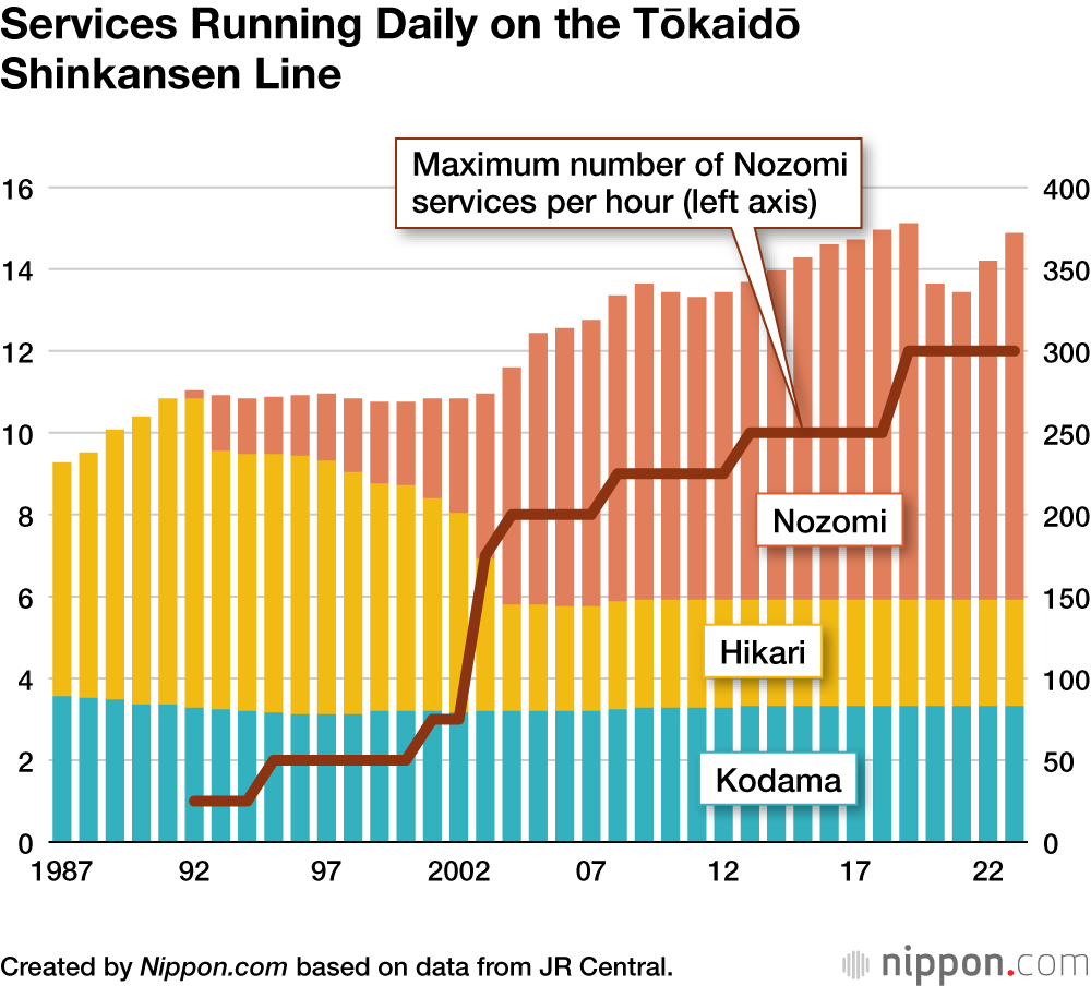 Initially, the Nozomi service only ran two round trips a day, but following the opening of the Shinkansen platforms at Shinagawa Station in 2003, the number of Nozomi trains increased considerably, surpassing those for the Hikari service. The Shinkansen currently takes two hours and twenty-one minutes between Tokyo and Shin-Osaka and runs at a maximum speed of 285 kilometers an hour. It is now possible for a maximum of 12 trains an hour to operate, around one every five minutes, and they depart as frequently as trains on conventional lines.