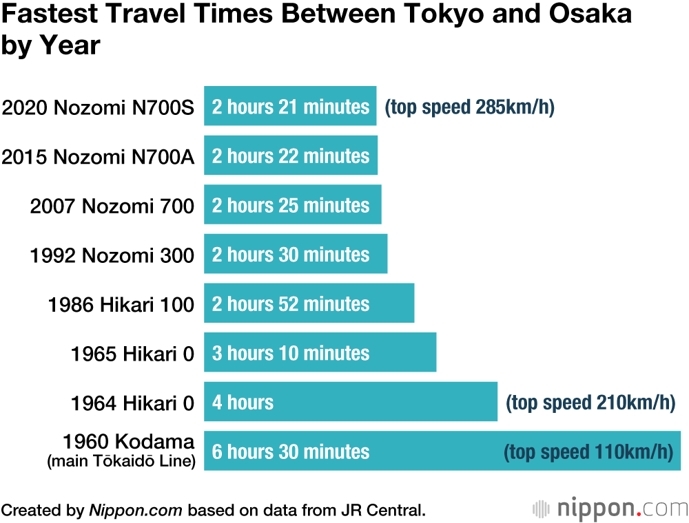 When the Tōkaidō Shinkansen, hailed as a “dream super express,” debuted in 1964, it linked Tokyo and Shin-Osaka stations in just four hours. This speed would hardly be regarded as “super express” today, but it was a revolutionary reduction in travel time from the six and a half hours it had previously taken to get from Tokyo to Osaka. A year later, in 1965, the originally planned travel time of three hours and ten minutes was achieved, making it possible, at a push, to make a day trip between the two cities.