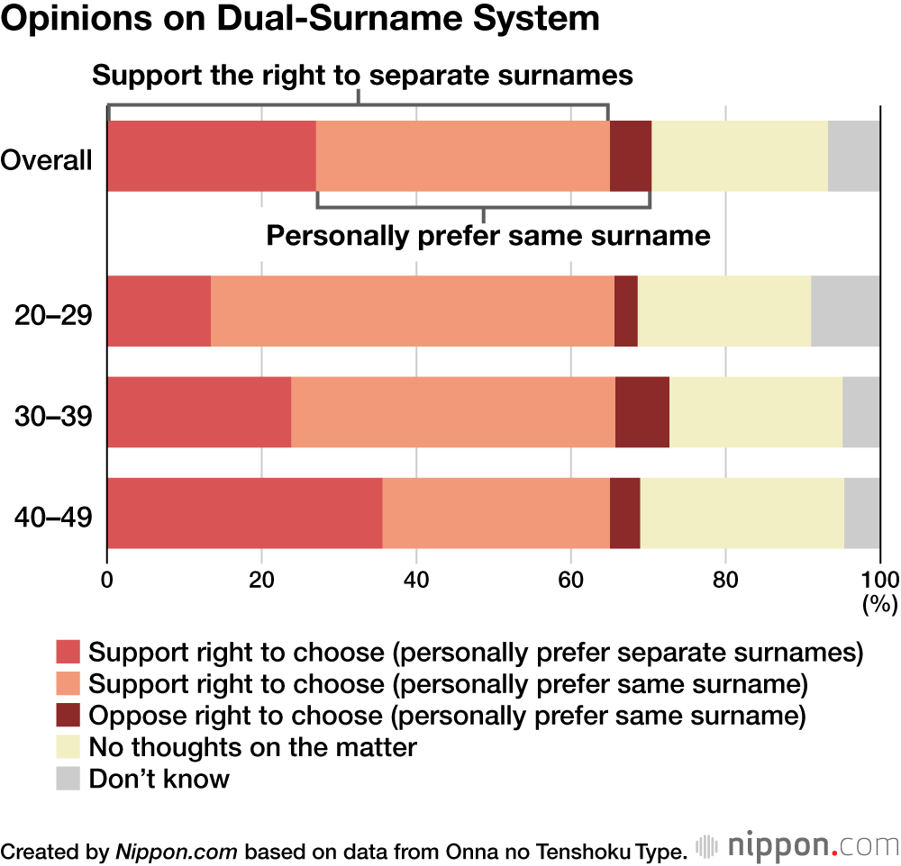 A total of 65% of respondents supported the right to separate surnames, combining the 27% who themselves would prefer separate surnames, and those who back allowing people to choose, while themselves preferring to use the same surname. Just 5.4% opposed the right to choose. The largest ratio of women who would prefer to use separate surnames from their husbands were aged in their forties.